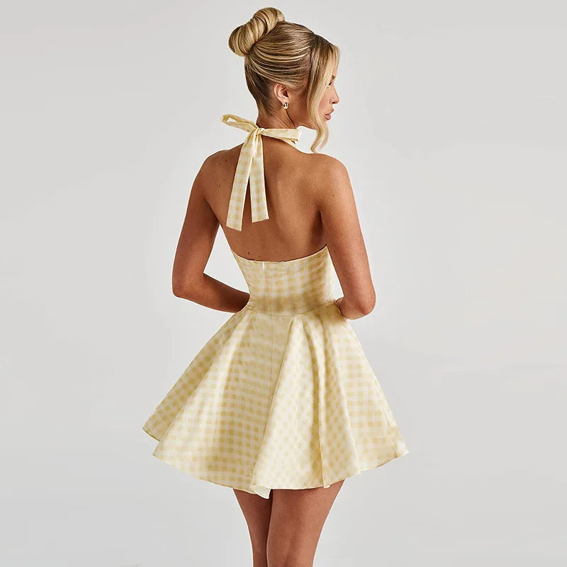 Mettete in mostra la vostra figura con il nostro mini abito da donna con scollo halter - senza schienale - e gonna svasata in linea - per un abbigliamento casual. Progettato con una lusinghiera scollatura halter, corpetto aderente e gonna svasata, questo abito è perfetto per le uscite estive e gli eventi casual. Senza schienale, in tessuto leggero e con una comoda silhouette ad A.