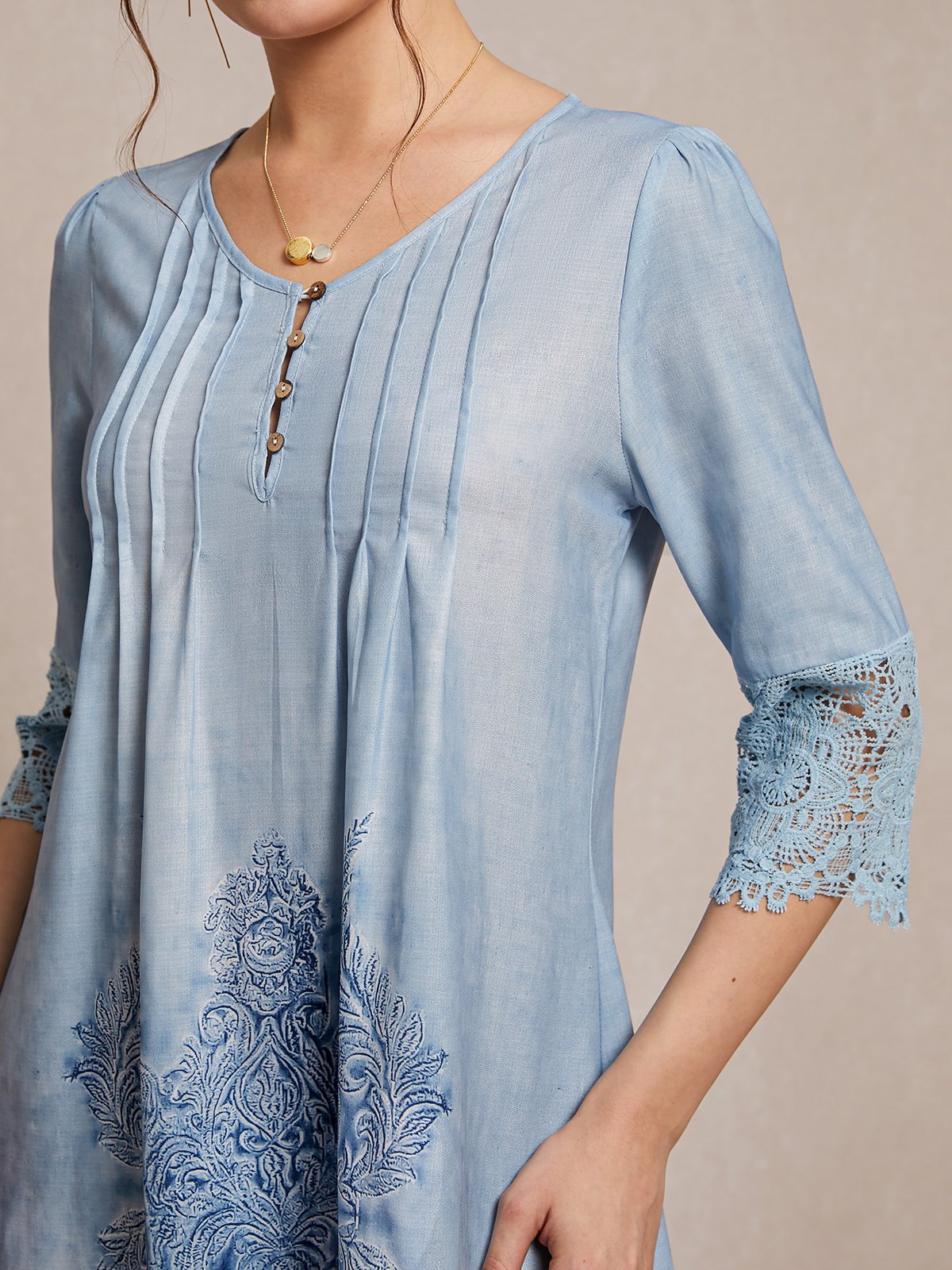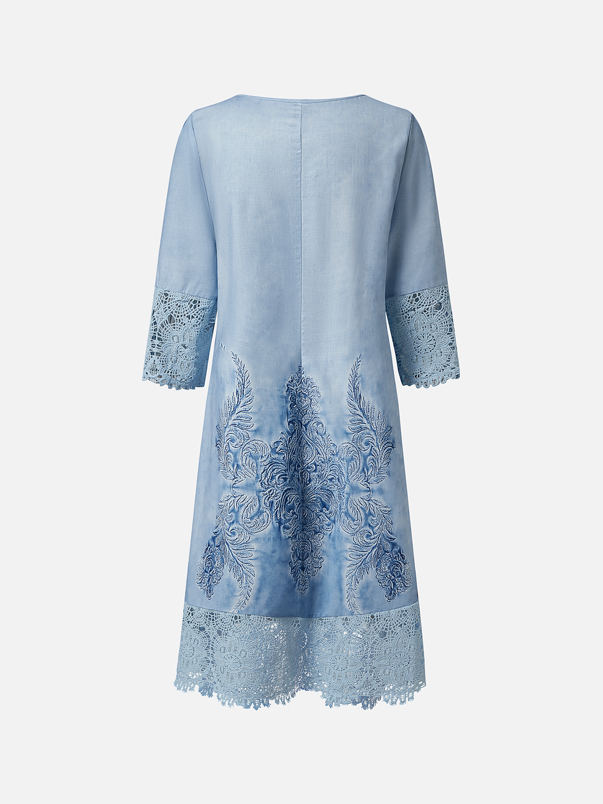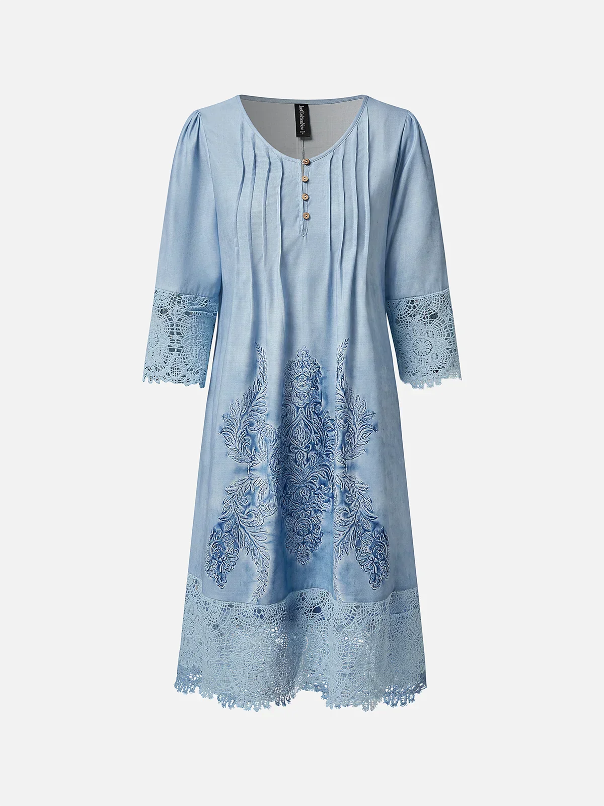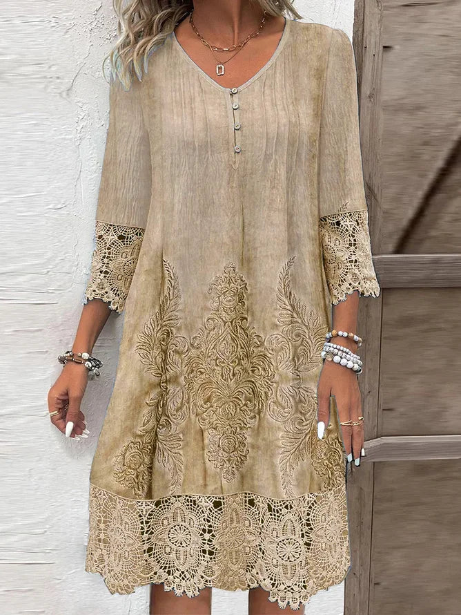 Scoprite l'eleganza senza tempo di questo abito da donna al ginocchio con pizzo e ricami. Con maniche a tre quarti, un'elegante scollatura a V e una delicata chiusura a bottoni, questo abito di Couture-Moda offre raffinatezza e comfort per ogni occasione.