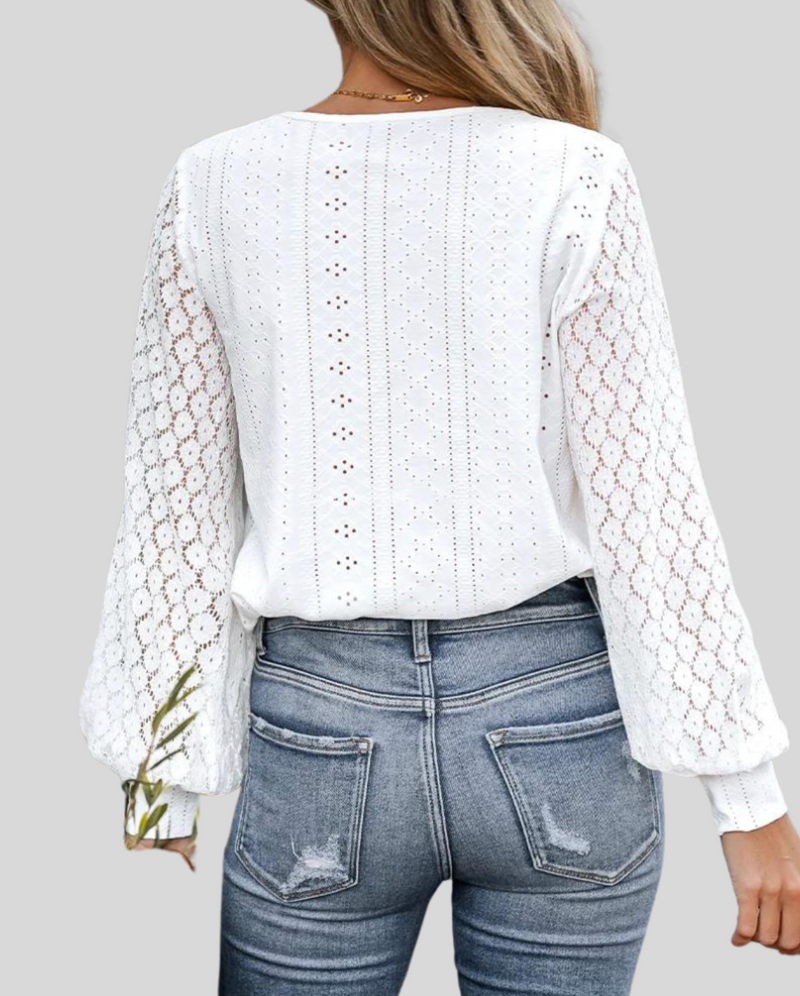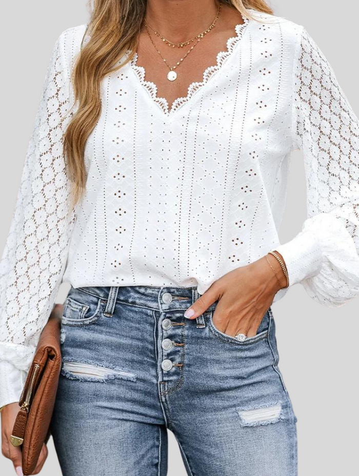 Questa blusa combina un pizzo sottile con un'elegante scollatura a V e maniche lunghe. Il tessuto morbido e la vestibilità comoda rendono questo modello ideale sia per l'abbigliamento casual che per quello da lavoro. Perfetta abbinata a pantaloni eleganti o jeans per un look sofisticato e versatile.