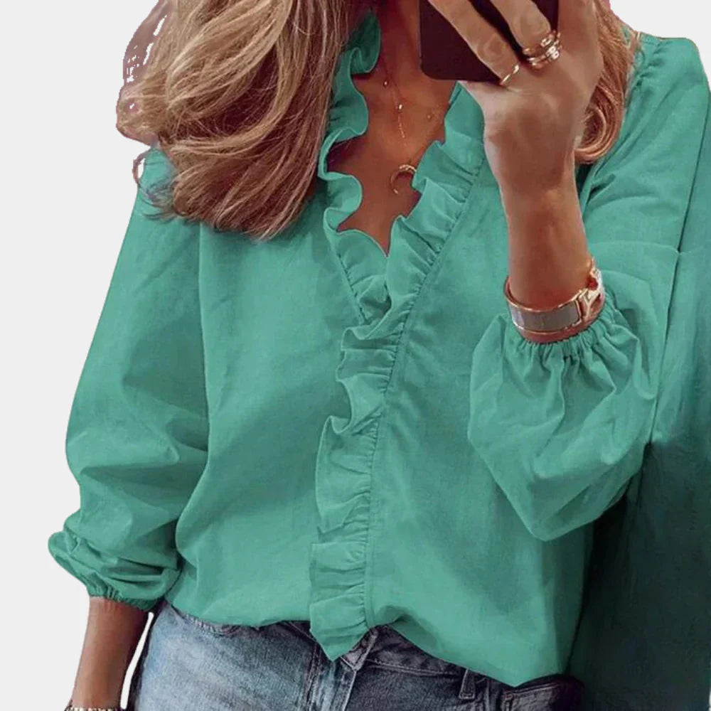 Caratterizzato da un'elegante scollatura a V e da incantevoli volant, questo top dalla vestibilità ampia offre la perfetta combinazione di comfort e stile. Il tessuto arioso e il taglio ampio lo rendono un capo versatile, adatto sia agli outfit casual che a quelli più eleganti.