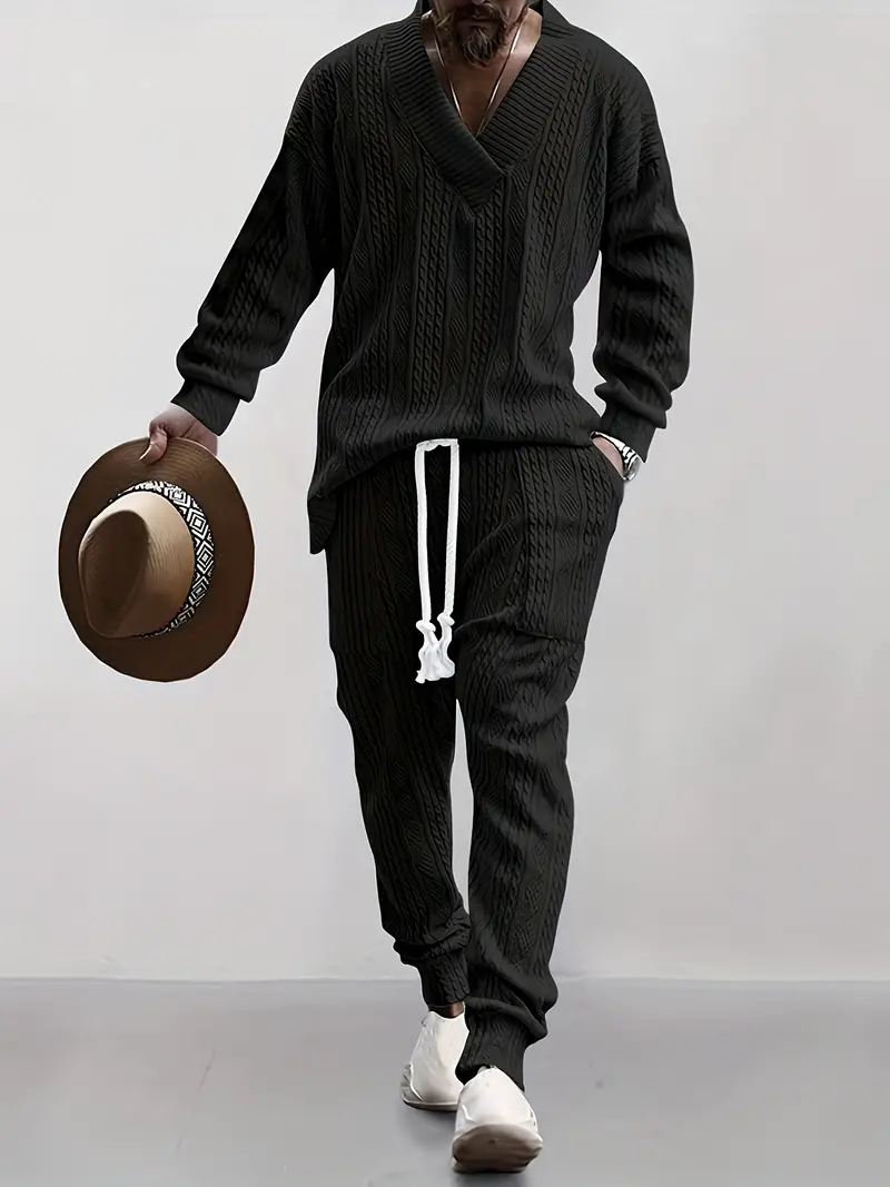 Стильный и комфортный мужской комплект для отдыха из мягкого вязаного трикожааа - элегантная кофточка с-образным вырезом и удобные штаны с эластичным поясом