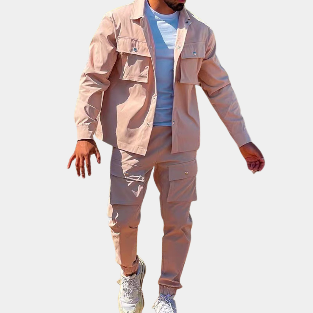 Elegante set LOUIS: giacca con cappuccio e pantaloni cargo funzionali per un look unico.